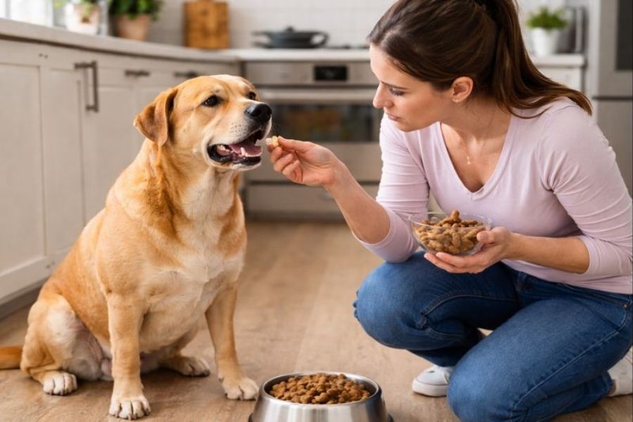 Try adding a bit of moisture, such as low sodium broth or canned food, to make meals more appealing. Also, stick to a feeding schedule and avoid giving excessive treats.